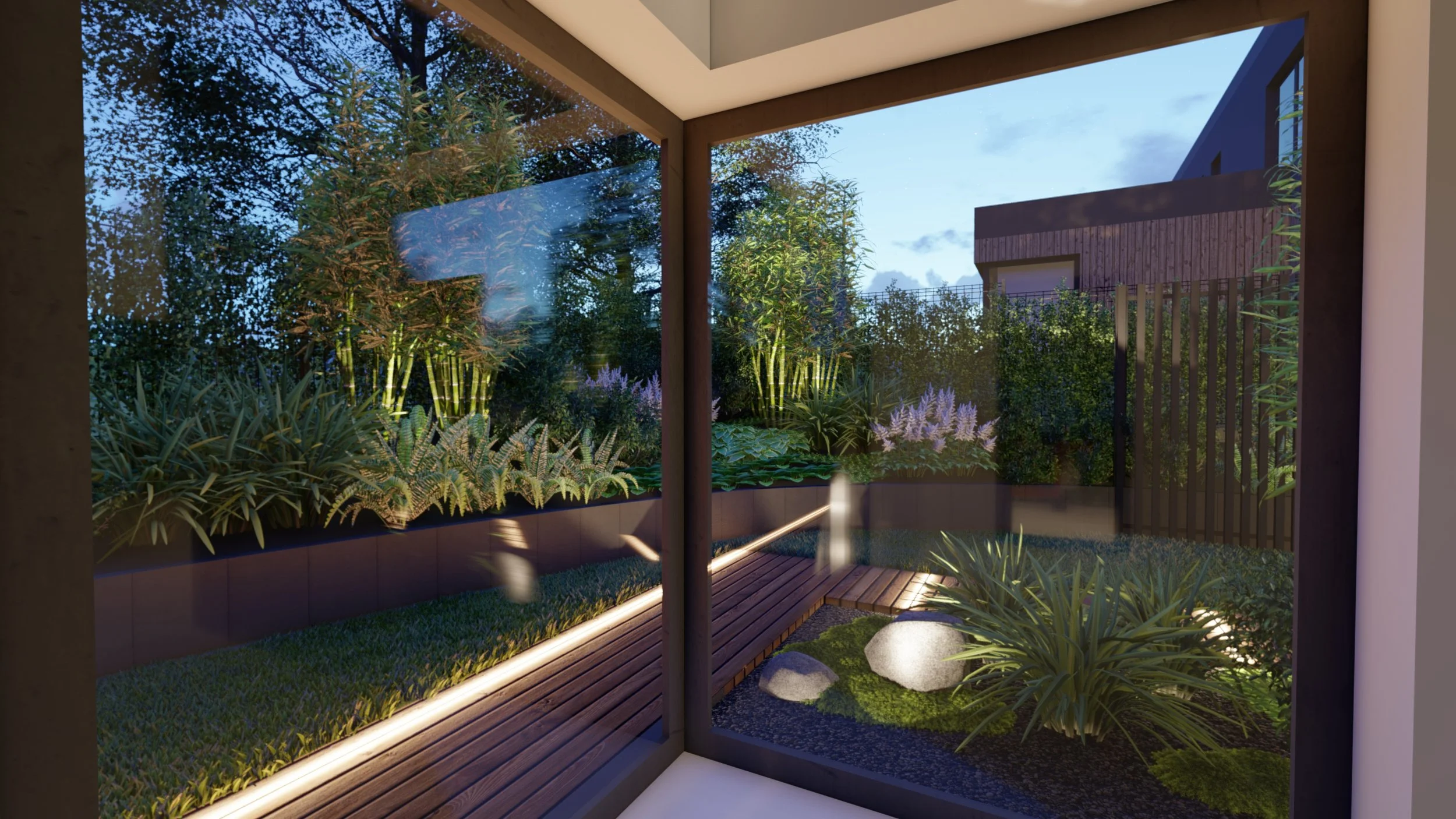 Drewniane podesty, nowoczesne pionowe przesłony, bujne nasadzenia zielonej roślinności próbującej uciec z rabat i bambus (Fargesia sp.) dopełniający kompozycji.